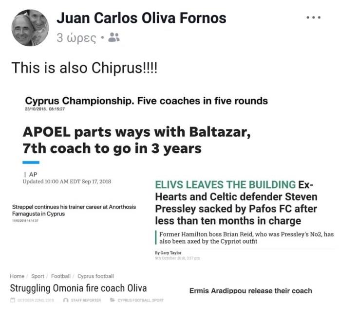 Ο πρώην προπονητής της Ομόνοιας με ανάρτησή του σχολίασε τις μαζικές αποδεσμεύσεις και έριξε την «σπόντα» του. «Αυτή είναι η Κύπρος» έγραψε σε μέσο κοινωνικής δικτύωσης ο Ισπανός τεχνικός.