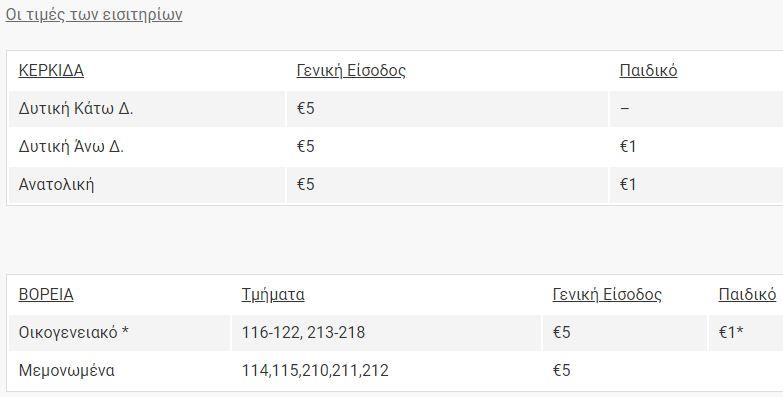 * Στο Οικογενειακό Τμήμα της Βόρειας κερκίδας, θα πρέπει το κανονικό εισιτήριο να συνδυάζεται με τουλάχιστο ένα παιδικό εισιτήριο. Το παιδικό εισιτήριο διατίθεται σε παιδιά κάτω των 14 χρονών.