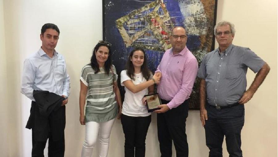 Αναμνηστική πλακέτα επέδωσε χθες ο Δήμαρχος Λάρνακας Ανδρέας Βύρας στη μαθήτρια του Γυμνασίου Δροσιάς Λάρνακας, Χαρά Φωκά, η οποία πήρε το πρώτο βραβείο του 47ου Παγκόσμιου Διαγωνισμού Συγγραφής Επιστολών για νεαρά άτομα.
