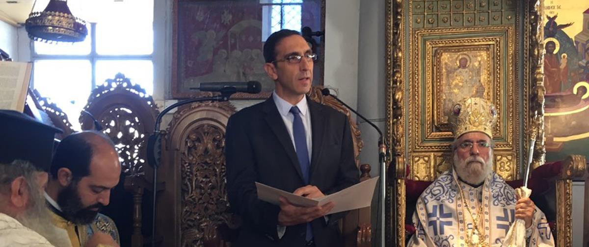 Σε χαιρετισμό του μετά την δοξολογία που τελέστηκε στο Μητροπολιτικό ναό Σωτήρος στη Λάρνακα, ο Υπουργός ανέφερε ότι στην Κύπρο μέρες σαν την σημερινή «μας υπαγορεύουν να ορθώσουμε το δικό μας ανάστημα και να ενισχύσουμε την αποφασιστικότητά μας για απαλλαγή της πατρίδας μας από την κατοχή, μέσα από ειρηνικό διάλογο, συνεργασίες και συμμαχίες".