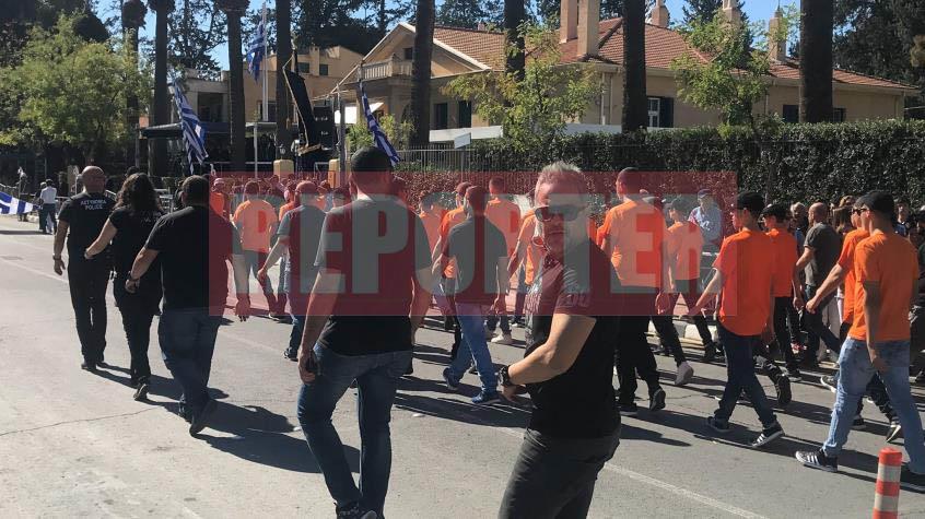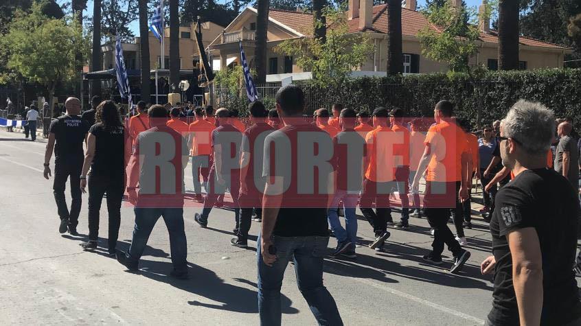 Οι οπαδοί των «γαλαζοκιτρίνων» που παρέλασαν με τη συνοδεία αστυνομικών, φώναξαν συνθήματα κατά της διζωνικής δικοινοτικής ομοσπονδίας και συγκεκριμένα, «αλήτες, προδότες, ομοσπονδιακοί, η Κύπρος είναι Ελληνική».