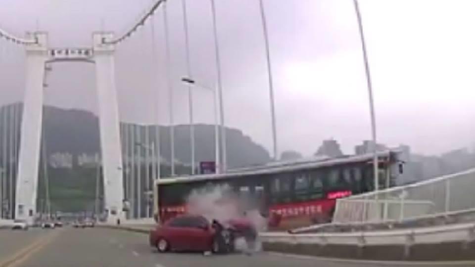 Η 42χρονη Κινέζα επιτέθηκε στον οδηγό όταν, αφού δεν είχε κατέβει στη στάση που ήθελε, του ζήτησε να την αφήσει να κατέβει πάνω στη γέφυρα. Ο οδηγός αρνήθηκε και τότε η γυναίκα του επιτέθηκε με τα χέρια της και στη συνέχει τον χτύπησε δυνατά με το κινητό της στο κεφάλι. Τότε φαίνεται πως ο οδηγός έχασε τον έλεγχο του αυτοκινήτου, κάνοντας μια απότομη αριστερή κίνηση στο τιμόνι, πριν κάνει αμέσως μετά την ανάποδη κίνηση.