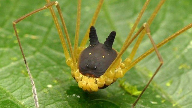 Πρόκειται για ένα αραχνοειδές που ονομάζεται «bunny harvestman» (Metagryne bicolumnata). Έχει μακριά κίτρινα πόδια και το κεφάλι του μοιάζει με κεφάλι μαύρου σκύλου!