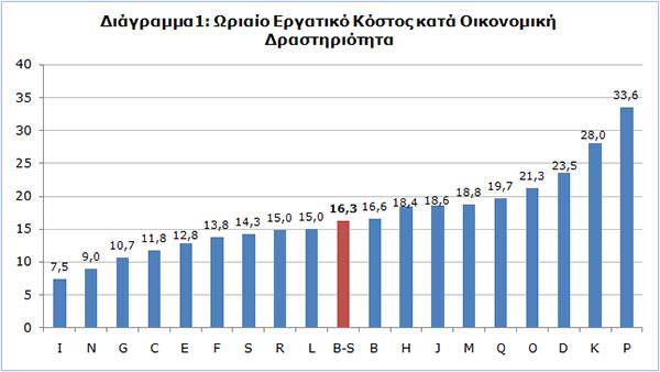 Το ωριαίο εργατικό κόστος κατά οικονομική δραστηριότητα σημειώνει μεγάλες αποκλίσεις. Το χαμηλότερο ωριαίο εργατικό κόστος καταγράφεται στον τομέα των Δραστηριοτήτων Υπηρεσιών Παροχής Καταλύματος και Υπηρεσιών Εστίασης με €7,50, ακολουθούμενο με €9,00 από τον τομέα Διοικητικών και Υποστηρικτικών Δραστηριοτήτων. Το υψηλότερο καταγράφεται στον τομέα της Εκπαίδευσης με €33,60 και ακολούθως στον τομέα των Χρηματοπιστωτικών και Ασφαλιστικών Δραστηριοτήτων με €28,00.