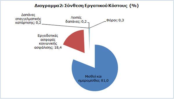 Το συνολικό εργατικό κόστος αποτελείται κυρίως από τους Μισθούς και Ημερομίσθια (81%) και τις Εργοδοτικές Εισφορές Κοινωνικής Ασφάλισης (18,4%). Οι Δαπάνες Επαγγελματικής Κατάρτισης που πραγματοποιεί ο εργοδότης, οι Φόροι που πληρώνει ο εργοδότης και οι Λοιπές Δαπάνες που πραγματοποιεί ο εργοδότης, συνιστούν ένα αμελητέο μέρος του συνολικού κόστους.