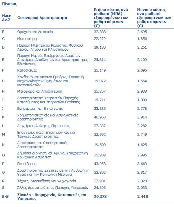 Το ετήσιο εργατικό κόστος ανά μισθωτό (σε μονάδες πλήρους απασχόλησης ΜΠΑ), εξαιρουμένων των μαθητευομένων, για το 2016 ήταν €29.373 και αντίστοιχα το μηνιαίο €2.448. Ο τομέας των Δραστηριοτήτων Υπηρεσιών Παροχής Καταλύματος και Υπηρεσιών Εστίασης παρουσιάζει το μικρότερο ετήσιο και μηνιαίο εργατικό κόστος με €15.711 και €1.309 αντίστοιχα, ενώ ο τομέας των Χρηματοπιστωτικών και Ασφαλιστικών Δραστηριοτήτων έχει το υψηλότερο με €46.968 και €3.914. (Πίνακας)