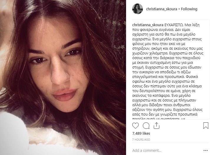 Λίγες ώρες μετά η Χριστιάννα Σκούρα έκανε την πρώτη της ανάρτηση στο Instagram.