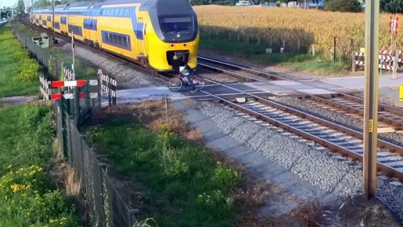 Με την δημοσιοποίηση ενός βίντεο από την παρολίγο μοιραία παράσυρση ενός ποδηλάτη με διερχόμενη αμαξοστοιχία επιχειρεί η ολλανδική εταιρεία σιδηροδρόμων να ευαισθητοποιήσει τους πολίτες σχετικά με τους κινδύνους που ελοχεύουν στις διαβάσεις του δικτύου της χώρας.