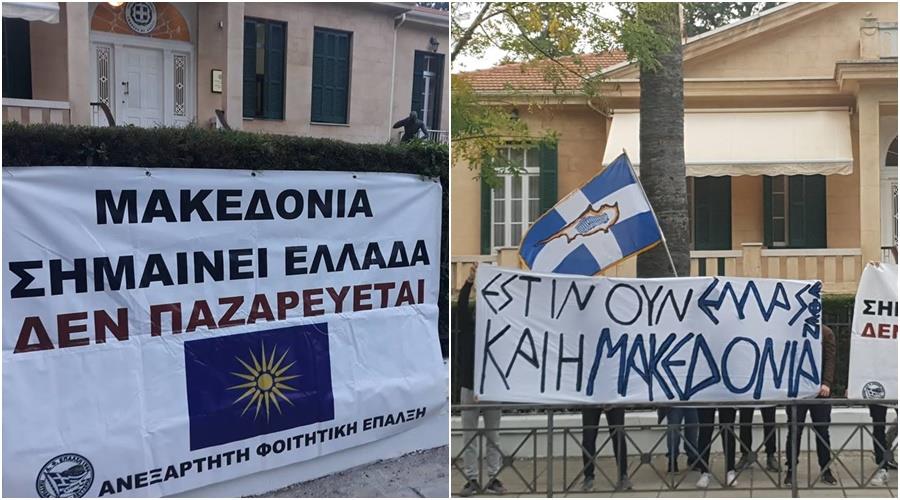 Σε συμβολική παρέμβαση έξω από την Ελληνική Πρεσβεία στη Λευκωσία προχώρησαν το πρωί μαθητές της Ανεξάρτητης Φοιτητικής Παράταξης ΕΠΑΛΞΗ Πανεπιστημίου Κύπρου και φοιτητές της Αυτόνομης Κίνησης Μαθητών ΕΦΕΝ με αφορμή τις πανελλήνιες κινητοποιήσεις των μαθητών για τη Μακεδονία και τη Συμφωνία των Πρεσπών.