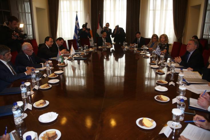 Ολοκληρώθηκαν οι εργασίες της 2ης Τριμερούς Υπουργικής Συνάντησης των ΥΠΕΞ Ελλάδας, Κύπρου και Παλαιστίνης, που πραγματοποιήθηκε σήμερα στην Αθήνα.