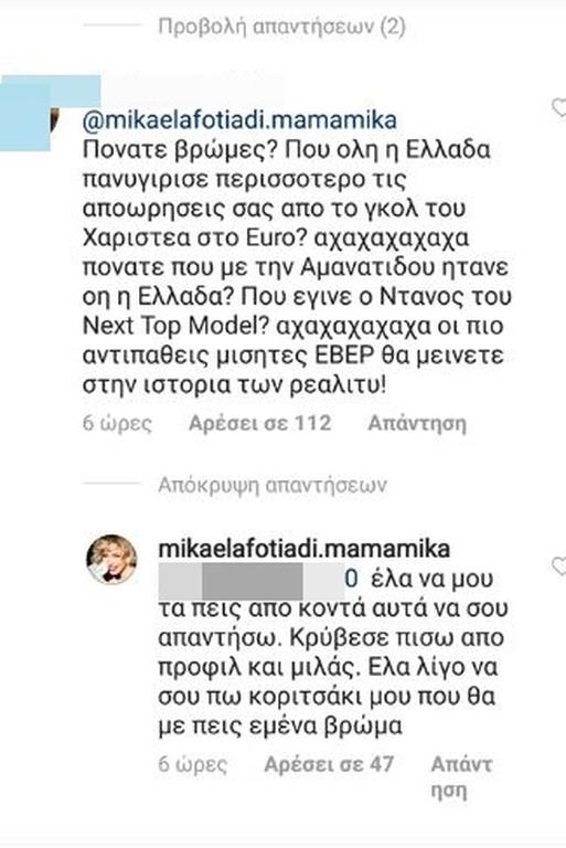 Η Μικαέλα που δε μασάει τα λόγια της απάντησε σε ένα από τα προσβλητικά σχόλια λέγοντας στη φανατική τηλεθεάτρια του Next Top Model: «Έλα να μου τα πεις αυτά από κοντά να σου απαντήσω. Κρύβεσαι πίσω από το προφίλ και μιλάς. Έλα λίγο να σου πω κοριτσάκι μου που θα με πεις εμένα βρ@μ@»!