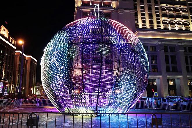 Η Μόσχα είναι το καλύτερο μέρος για να γιορτάσει κανείς τα Χριστούγεννα στη Ρωσία. Το φεστιβάλ των Χριστουγέννων ξεκινά από την πλατεία Manezh, όπου στεγάζονται ένα από τα κυριότερα αξιοθέατα – η μεγάλη, λαμπερή μπάλα με χιλιάδες LED φώτα. Η συγκεκριμένη μπάλα δεν έχει μόνο διακοσμητικό χαρακτήρα αφού, διαθέτει πίστα στην οποία θα μπορούν οι επισκέπτες να χορέψουν και να περπατήσουν μέσα σε αυτήν.