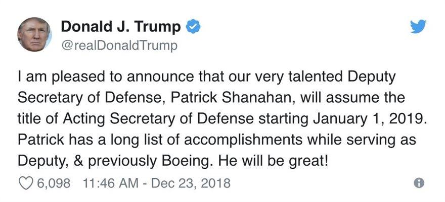 Με ανάρτησή του στο twitter o Αμερικανός πρόεδρος έκανε γνωστό ότι ο μέχρι τώρα αναπληρωτής υπουργός Άμυνας Πάτρικ Σάναχαν θα αναλάβει τα ηνία του πενταγώνου μετά τον Τζειμς Μάτις.