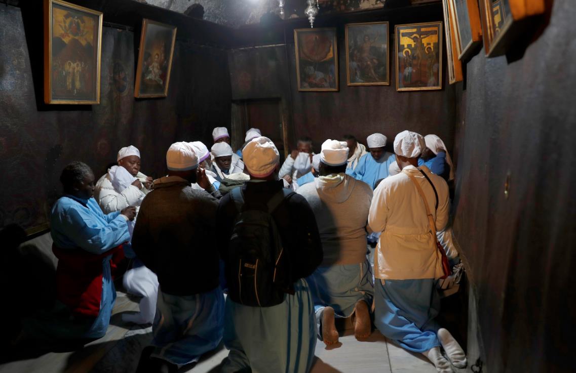 Προσκύνητες απ' όλον τον κόσμο συγκεντρώθηκαν σήμερα, παραμονή των Χριστουγέννων, κοντά στη Βασιλική της Γεννήσεως στη Βηθλεέμ, τον τόπο όπου γεννήθηκε ο Ιησούς, σύμφωνα με τη χριστιανική παράδοση.