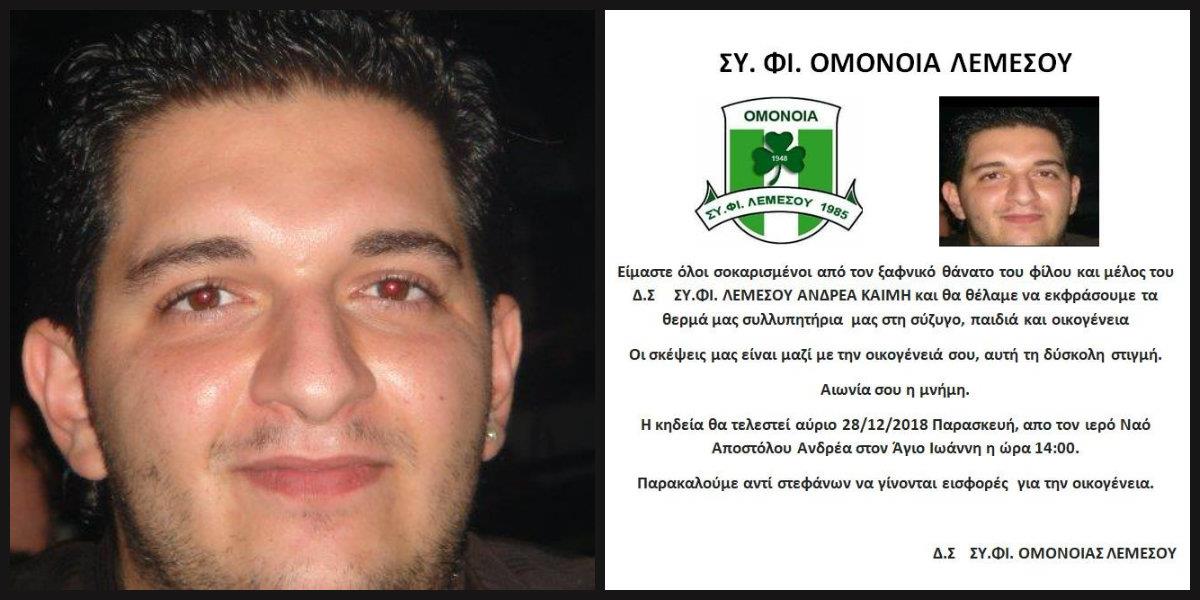 «Η οικογένεια της ΟΜΟΝΟΙΑΣ θρηνεί τον άδικο χαμό του 34χρονου Ανδρέα Καΐμη, του οποίο το νήμα της ζωής κόπηκε ξαφνικά τα ξημερώματα της 26ης Δεκεμβρίου.