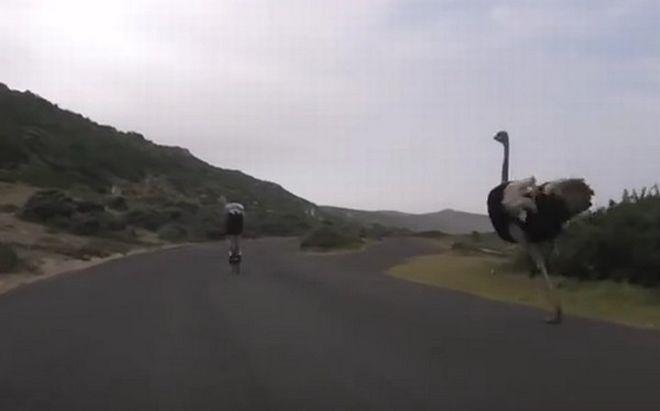 Ένα ασυνήθιστο περιστατικό κατέγραψε ποδηλάτης που συμμετείχε στο Cape Argus Tour της Νοτίου Αφρικής. Ο αθλητής εντόπισε αίφνις να μπαίνει στο δρόμο μια γιγάντια στρουθοκάμηλος, η οποία και πήρε στο κατόπι τους συμποδηλάτες του. "Αρχικά ήταν κάπως τρομακτικό, αλλά στη συνέχεια κόντεψα να πέσω από το ποδήλατο από τα γέλια". Το πτηνό πάντως αποδεικνύεται ικανότατος δρομέας, αφού δεν δυσκολεύτηκε να ακολουθεί κατά πόδας τους ποδηλάτες με ταχύτητα που ξεπερνούσε τα 50χλμ/ώρα και για αρκετά λεπτά.