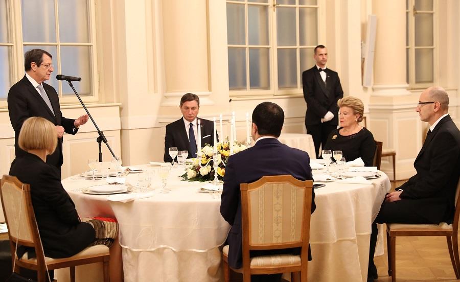 Ο Πρόεδρος Αναστασιάδης δήλωσε ότι οι συζητήσεις που είχε με τον Πρόεδρο της Σλοβενίας έχουν αποκαλύψει το κοινό όραμα των δύο χωρών για μια κοινωνικότερη ΕΕ, σε σύντομο χαιρετισμό του σε επίσημο δείπνο που παρέθεσε προς τιμή του ο Πρόεδρος της Σλοβενίας Μπόρουτ Πάχορ, στο πλαίσιο της επίσημης επίσκεψης του Προέδρου της Δημοκρατίας στη Λουμπλιάνα.
