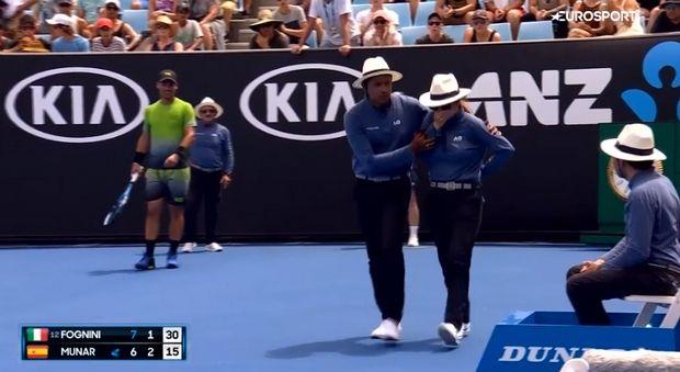 Η επόπτρια αποχώρισε και μετά από λίγα λεπτά επέστρεψε και πάλι στη θέση της με τον Μουνάρ να την πετυχαίνει ξανά! Για να γίνει αντιληπτός ο πόνος που ένιωσε η επόπτρια αρκεί να πούμε ότι κατά μέσο όρο τα σερβίς στο ανδρικό τένις αγγίζουν τα 200 χιλιόμετρα την ώρα.
