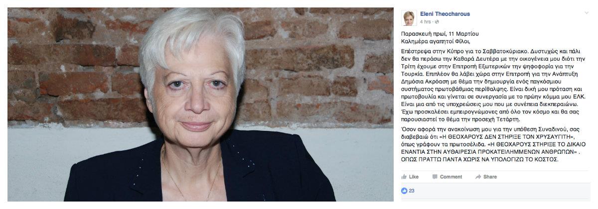 Με αυτή την ανάρτηση η Ευρωβουλευτής Ελένη Θεοχάρους θέλησε να απαντήσει στα δημοσιεύματα ανανφορικά με την αντίθεσή της στο θέμα της αποβολής του Βουλευτή της Χρυσής Αυγής, Ελ.Συναδινού, από το Ευρωκοινοβούλιο.