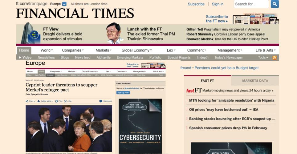 Οι FT γράφουν επίσης ότι όπως οι περισσότερες ευρωπαϊκές αντιπροσωπείες στις Βρυξέλλες, έτσι και οι Κύπριοι διπλωμάτες είπαν ότι αιφνιδιάστηκαν από τη συμφωνία Μέρκελ-Νταβούτογλου που παρουσιάστηκε την τελευταία στιγμή στη σύνοδο για το προσφυγικό. Ανέφεραν δε ότι το θέμα ανοίγματος των κεφαλαίων δεν είχε τεθεί στις προπαρασκευαστικές της συνόδου συναντήσεις.