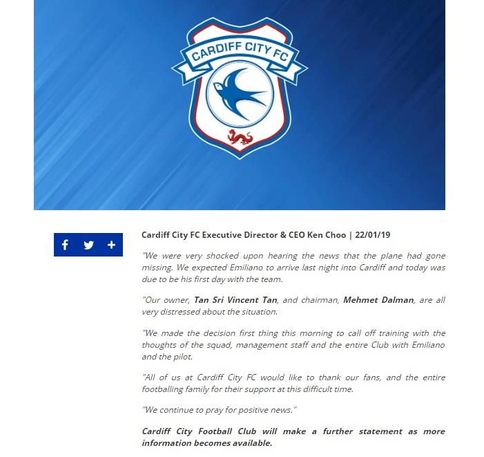 «Σοκαριστήκαμε στο άκουσμα της είδησης ότι το αεροπλάνο έχει χαθεί. Περιμέναμε τον Εμιλιάνο να έρθει χθες το βράδυ στο Κάρντιφ και σήμερα θα ήταν η πρώτη του ημέρα στην προπόνηση της ομάδας.