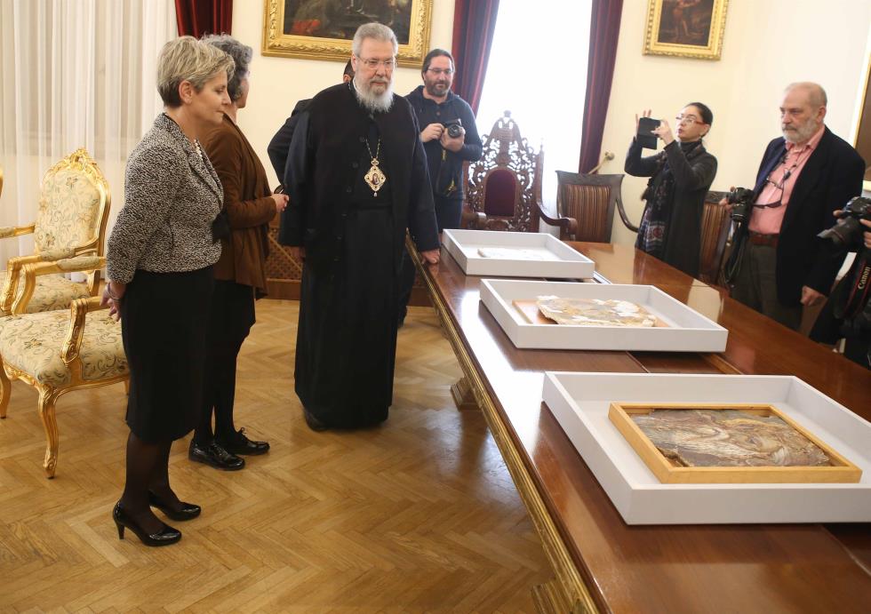 Από την πλευρά της, η Διευθύντρια του Τμήματος Αρχαιοτήτων Μαρίνα Σολομίδου – Ιερωνυμίδου ευχαρίστησε τον Αρχιεπίσκοπο για τη στήριξή του, τους συντηρητές, τον Υπαστυνόμο Μιχάλη Γαβριηλίδη, τον Λεωνίδα Γεωργίου, τον Πρέσβη της Κύπρου στη Χάγη Ελπιδοφόρου Οικονόμου και την Υπουργό Μεταφορών.