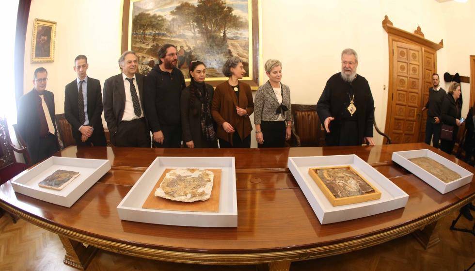 Οι τέσσερις τοιχογραφίες που επαναπατρίστηκαν νωρίτερα αυτή την εβδομάδα από τη Χάγη, παραδόθηκαν σήμερα από την Υπουργό Μεταφορών, Επικοινωνιών και Έργων Βασιλική Αναστασιάδου στον Αρχιεπίσκοπο Κύπρου Χρυσόστομο, στην Αρχιεπισκοπή.