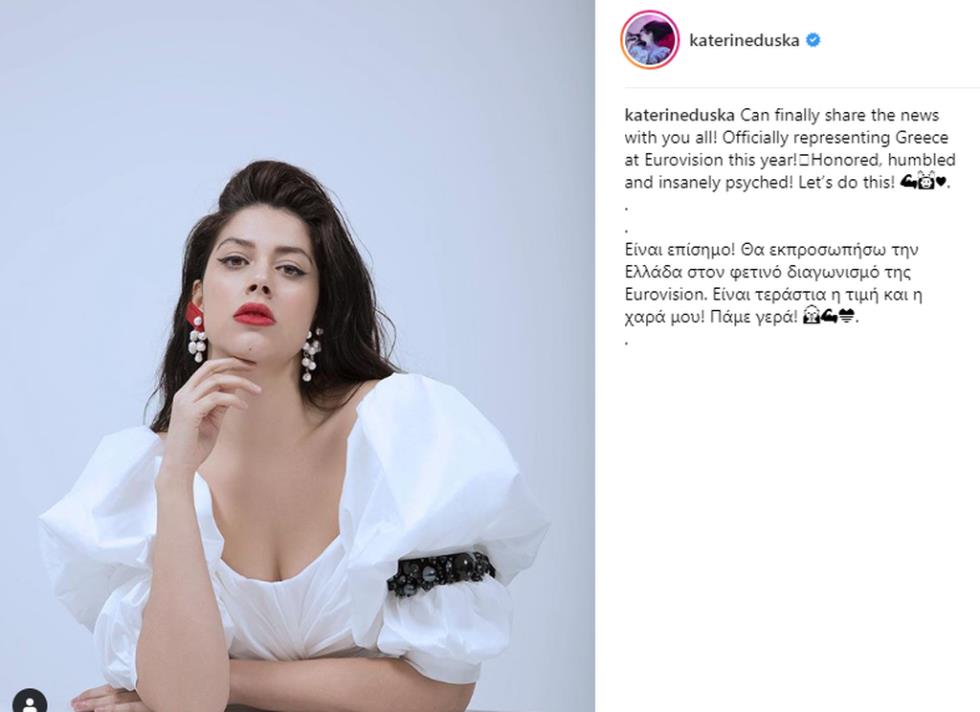 «Είναι επίσημο! Θα εκπροσωπήσω την Ελλάδα στον φετινό διαγωνισμό της Eurovision. Είναι τεράστια η τιμή και η χαρά μου! Πάμε γερά!», έγραψε χαρακτηριστικά η Κατερίνα Ντούσκα!