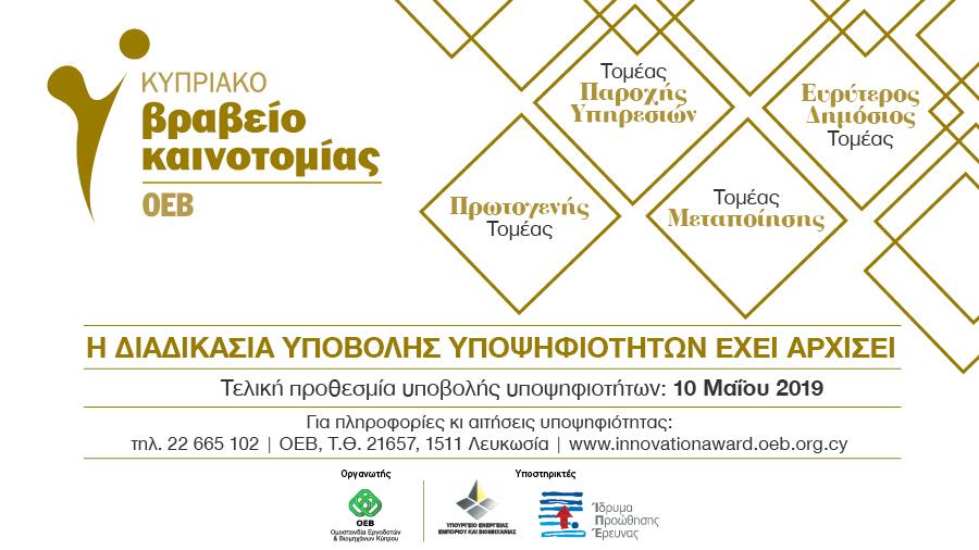 Για πληροφορίες και αιτήσεις υποψηφιότητας, επικοινωνήστε με την ΟΕΒ στο τηλέφωνο 22 665 102 ή στην ιστοσελίδα www.innovationaward.oeb.org.cy