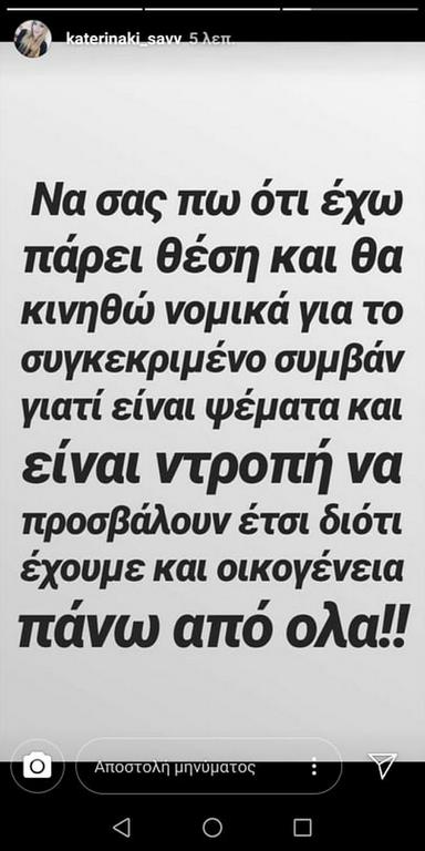 Και η Κατερίνα Σαββοπούλου μέσω instastory έστειλε το μήνυμά της: «Να σας πω ότι έχω πάρει θέση και θα κινηθώ νομικά για το συγκεκριμένο συμβάν. Γιατί είναι ψέματα και είναι ντροπή να προσβάλλουν έτσι, διότι έχουμε και οικογένεια πάνω από όλα».