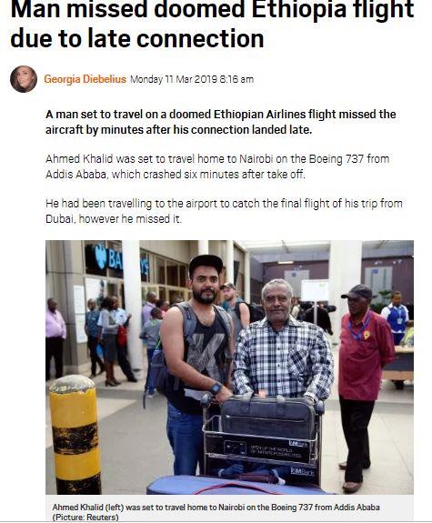 Ο λόγος για τον Αχμέντ Χαλίντ, ο οποίος είχε ξεκινήσει από το Ντουμπάι για την πόλη της Αιθιοπίας και από εκεί θα έπαιρνε άλλο αεροπλάνο για το Ναϊρόμπι. Μόνο που η πρώτη του πτήση καθυστέρησε και έτσι, για καλή του τύχη, δεν πρόλαβε να επιβιβαστεί σε αυτή.