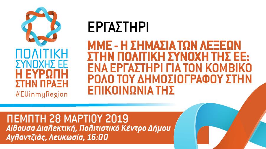 Το Ανοικτό Πανεπιστήμιο Κύπρου διοργανώνει την Πέμπτη 28 Μαρτίου 2019 Eργαστήρι, με θέμα: «ΜΜΕ-Η σημασία των Λέξεων στην πολιτική συνοχή της Ε.Ε.: Ένα εργαστήρι για τον κομβικό ρόλο του Δημοσιογράφου στην επικοινωνία της».