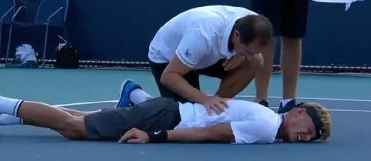 Tremenda imagen de Nicola #Kuhn: Colapsó por fuertes calambres durante su partido frente a Mischa Zverev, en el que estuvo 6-4, 5-2 adelante y desperdició 8 match points 😱pic.twitter.com/2hzHuwit1e