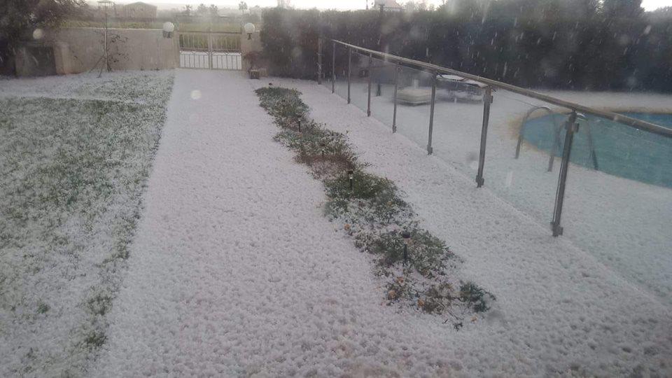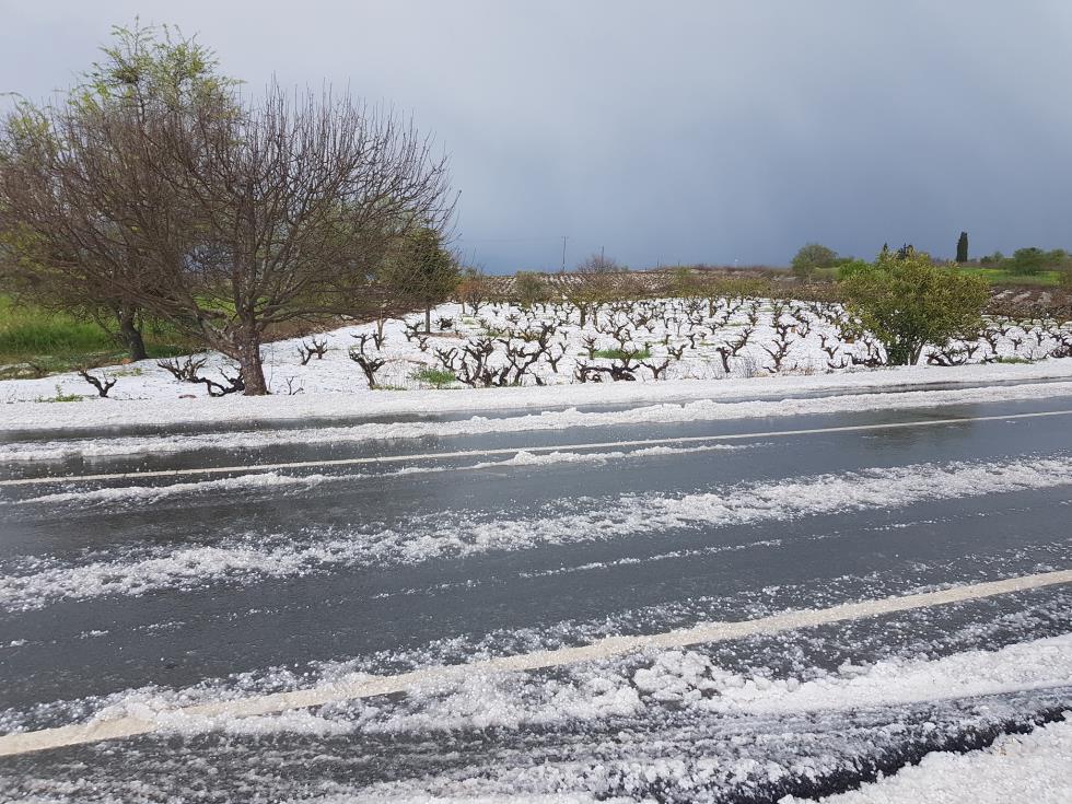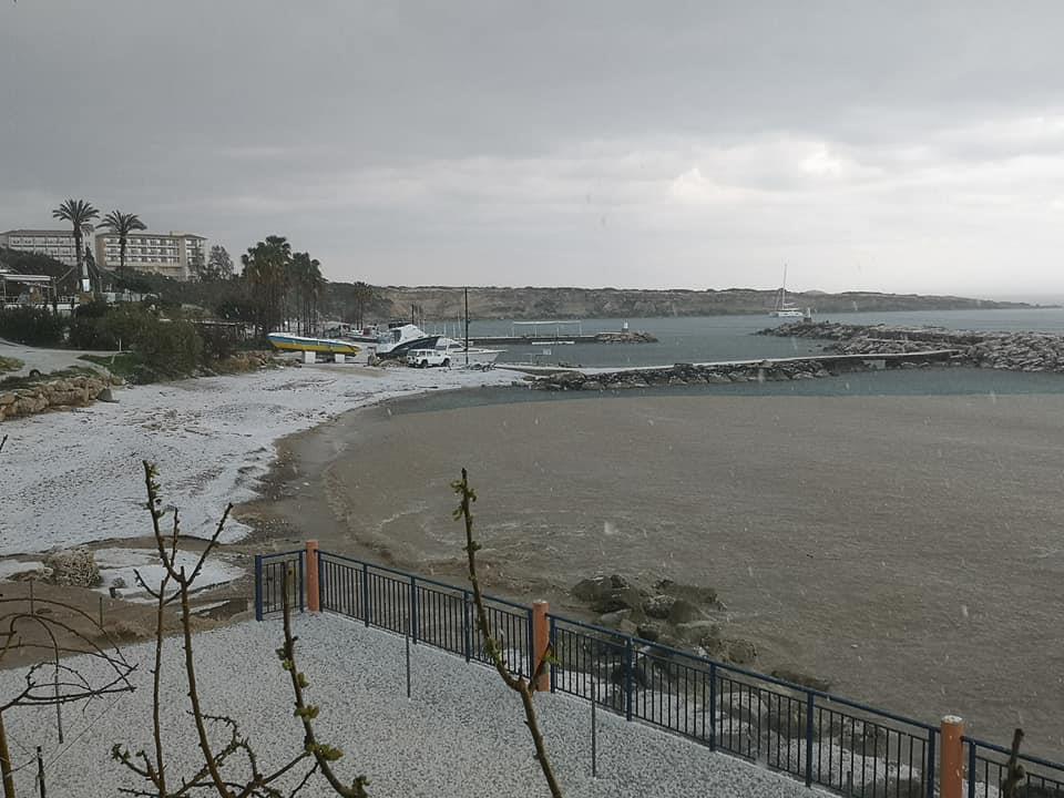 Σπάνιας ομορφιάς εικόνες, αλλά και προβλήματα προκάλεσε η χαλαζόπτωση που πλήττει από νωρίς το μεσημέρι τις Επαρχίες Λεμεσού και Πάφου.