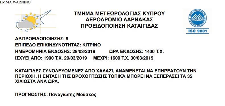 Το απόγευµα ο καιρός θα είναι κυρίως συννεφιασµένος και αναµένονται τοπικές βροχές και µεµονωµένες καταιγίδες. Στις περιοχές των καταιγίδων πιθανό να πέσει και χαλάζι, ενώ τοπικά τα φαινόµενα µπορεί να είναι έντονα. Στις ψηλότερες κορυφές του Τροόδους δεν αποκλείεται να πέσει χιόνι ή χιονόνερο. Η σκόνη που υπάρχει στην ατµόσφαιρα αναµένεται σταδιακά να αποµακρυνθεί.