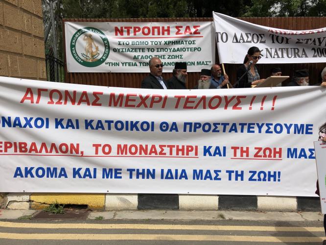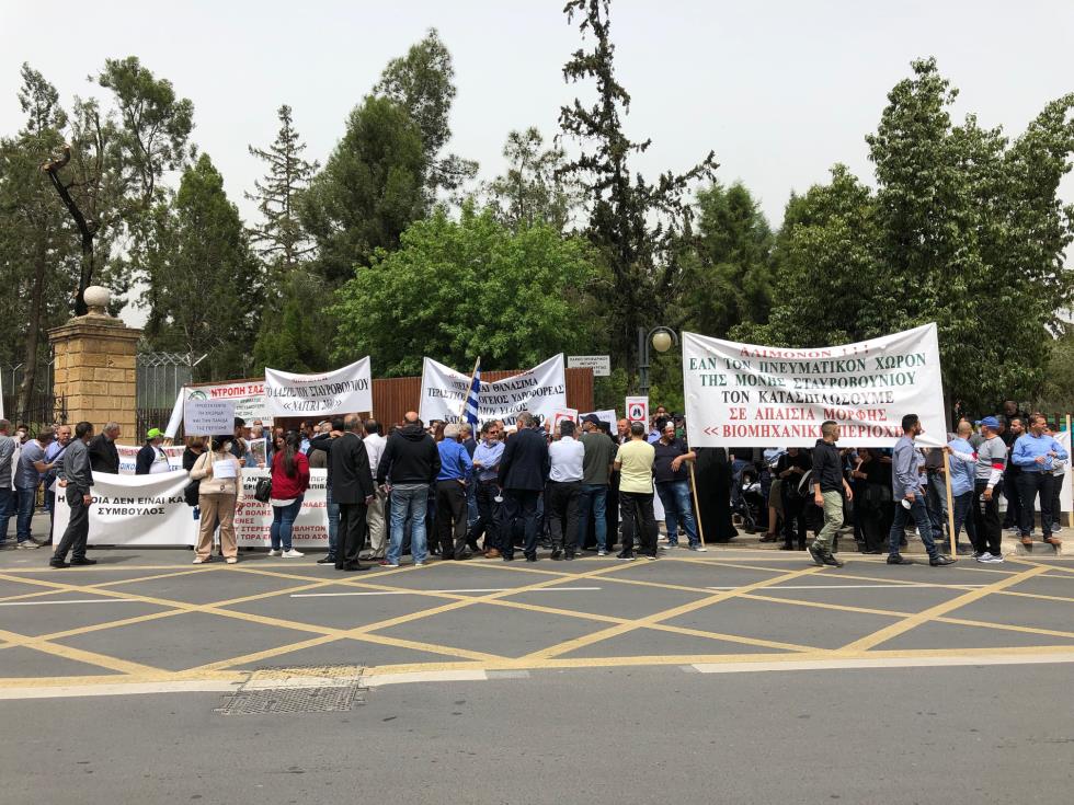 Ειρηνική εκδήλωση διαμαρτυρίας ενάντια στην απόφαση της Πολιτείας να δώσει τη συγκατάθεση της στο αίτημα της εταιρείας «Σκύρα Λίμα-Αδελφοί Ιακώβου Λτδ« για τη δημιουργία εργοστασίου ανακύκλωσης και παραγωγής ασφαλτικού σκυροδέματος στην περιοχή Σταυροβουνίου, πραγματοποίησαν, έξω από το Προεδρικό, η Ομάδα Πρωτοβουλίας Πυργών - Κόρνου και η ομάδα Φίλοι της Ιεράς Μονής Σταυροβουνίου.