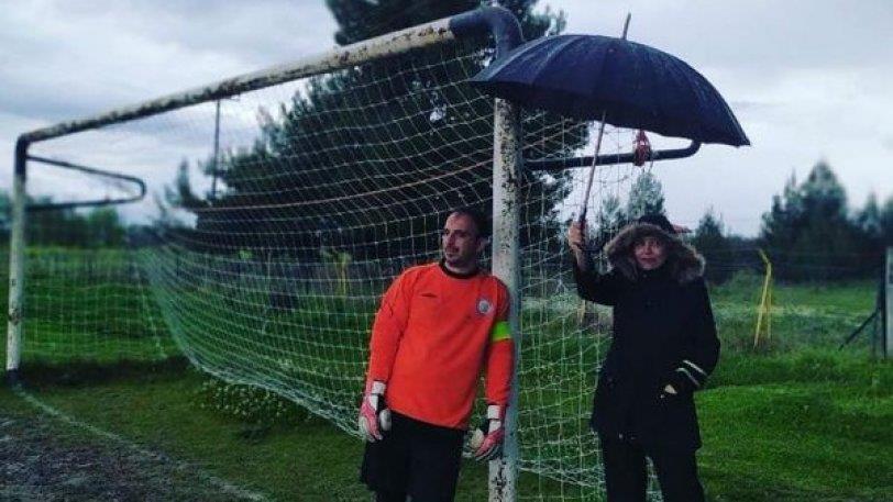 O Γιάννης Πάνου, που έκατσε κάτω από τα γκολπόστ των Καμένων Βούρλων είχε και την... προστασία της μάνας του, η οποία του κρατούσε την ομπρέλα για να μη βραχεί.