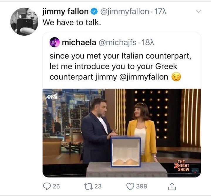 Στη λεζάντα της φωτογραφίας, ο ακόλουθος του Jimmy Fallon έγραψε χαρακτηριστικά: «Αφού συναντήσατε τον ιταλικό ομόλογό σας, επιτρέψτε μου να σας συστήσω στον Έλληνα». Και τότε ο Jimmy Fallon με το γνωστό χιούμορ που διαθέτει, είπε σχεδόν... απειλητικά: «Εμείς πρέπει να μιλήσουμε».