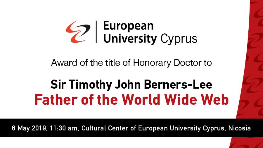 Την Δευτέρα 6 του Μάη στις 12 το μεσημέρι, το Ευρωπαικό Πανεπιστήμιο Κύπρου υποδέχεται τον Sir Timothy Berners-Lee, καθώς αναγορεύεται απο την Σύγκλητο σε Επίτιμο Διδάκτορα της Σχολής Επιστημών του Ευρωπαϊκού Πανεπιστημίου Κύπρου.