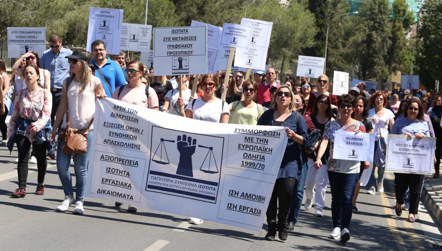 Με πορεία από το Υπουργείο Οικονομικών προς το Προεδρικό, άρχισε σήμερα η 48ωρη απεργία της Παγκύπριας Συντεχνίας Ισότητας, υπέρ των δικαιωμάτων των Εργοδοτουμένων Ορισμένου και Αορίστου Χρόνου στον ευρύτερο δημόσιο τομέα.