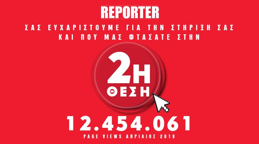 Μετά από μόλις τρία χρόνια ζωής, ο REPORTER έχει καταφέρει ν’ ανέβει στη δεύτερη θέση των μετρήσεων, με συνολικά 12.5 εκατομμύρια pageviews.