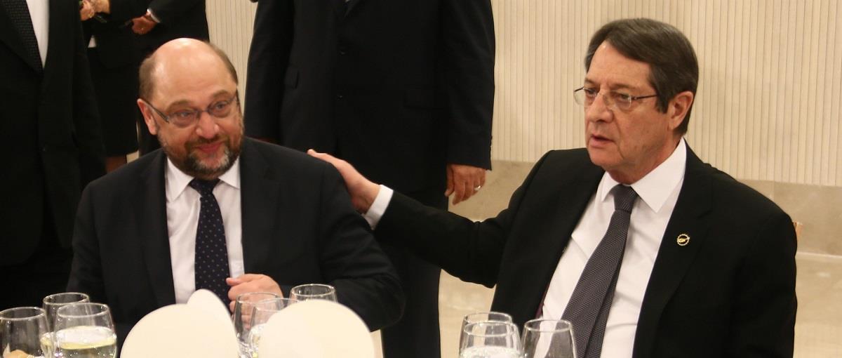 Το Κυπριακό είναι πρόβλημα ευρωπαϊκό και θα πρέπει η λύση του να στηρίζεται στις αρχές της Ευρωπαϊκής Ένωσης, δήλωσε ο πρόεδρος Αναστασιάδης στη διάρκεια δείπνου που παρέθεσε το βράδυ της Τρίτης προς τιμήν του Προέδρου του Ευρωπαϊκού Κοινοβουλίου, Μάρτιν Σουλτς.