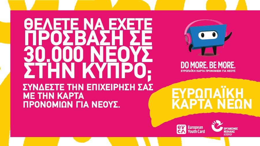 Η επιχείρησή συνδέεται με συνολικά 6.000.000 νέους πανευρωπαϊκά, κατόχους της κάρτας, οι οποίοι ενημερώνονται για τα οφέλη της με ισχύ σε περισσότερες από 100.000 επιχειρήσεις σε ολόκληρη την Ευρώπη. Παράλληλα, αναβαθμίζεται το προφίλ της επιχείρησης στη συνείδηση των νέων, ενώ ενισχύεται και το προφίλ της εταιρικής κοινωνικής ευθύνης. Τέλος, οι επιχειρήσεις επωφελούνται από ένα δυναμικό πρόγραμμα προβολής της Ευρωπαϊκής Κάρτας Νέων, καθώς η κάρτα όπως και οι επιχειρήσεις που είναι συνδεδεμένες με αυτήν προωθούνται μέσα από μια σειρά επικοινωνιακών μέσων και κινήσεων.