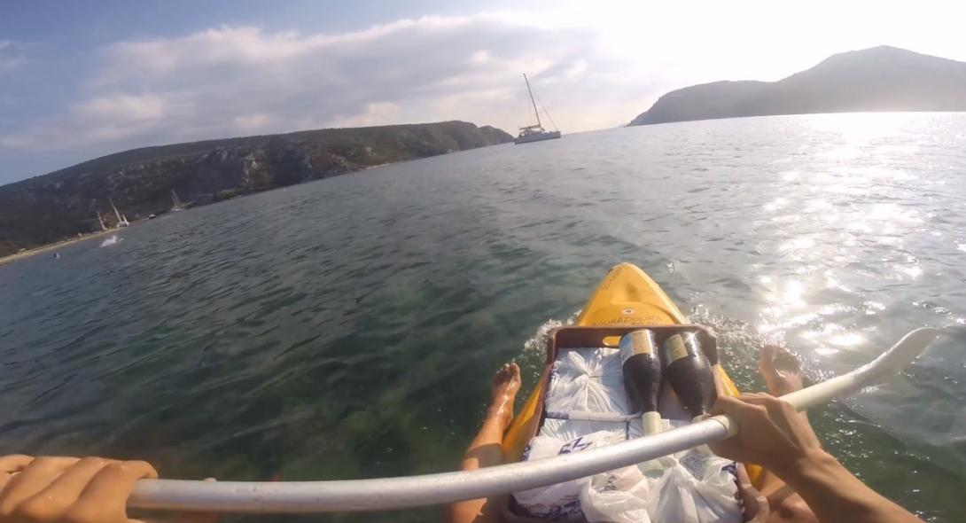 Ο «ντελιβεράς» φορά το σωσίβιο του, πιάνει το κουπί, μπαίνει στο κανό και μεταφέρει φαγητά και ποτά στα σκάφη που έχουν δέσει στο Πόρτο Κουφό.