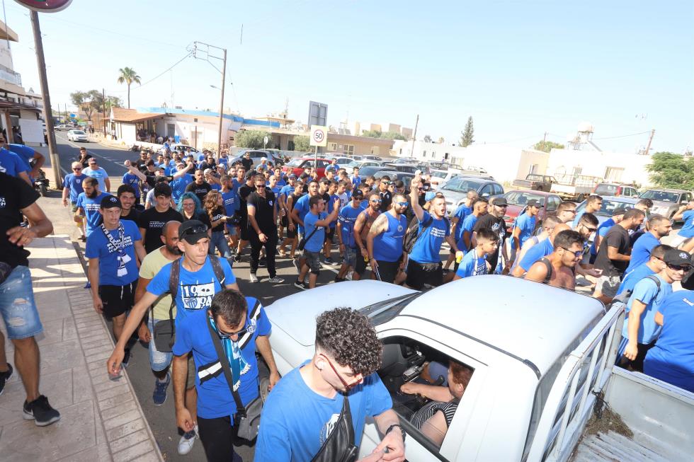 Οι οργανωμένοι της «Κυρίας» έφτιαξαν ατμόσφαιρα με συνθήματα λίγο πριν την πορεία προς το γήπεδο που θα διεξαχθεί η πρώτη προπόνηση της ομάδας.