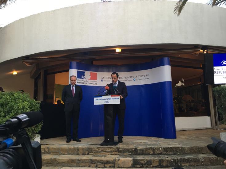 Παράλληλα, εξέφρασε εκ μέρους του Προέδρου της Δημοκρατίας, της κυβέρνησης και του κυπριακού λαού, «τη βαθύτατη εκτίμησή μας μας για τη διαχρονική στήριξη και ενδιαφέρον που επιδεικνύει η Γαλλική Δημοκρατία στις προσπάθειες που καταβάλλουμε για επίλυση του κυπριακού προβλήματος, στη βάση της διζωνικής δικοινοτικής ομοσπονδίας, των ψηφισμάτων των Ηνωμένων Εθνών, των αρχών και αξιών της Ευρωπαϊκής Ένωσης καθώς και του ευρωπαϊκού κεκτημένου».