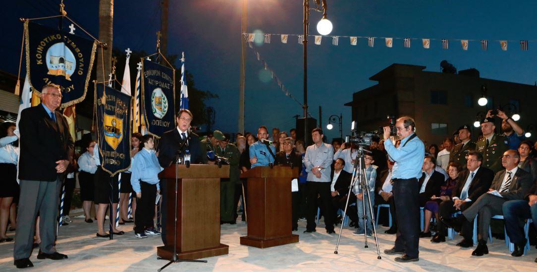 Αναφερόμενος στον αγώνα της ΕΟΚΑ, ο Πρόεδρος Αναστασιάδης είπε ότι «έληξε έχοντας ως αποτέλεσμα τη δημιουργία του σημερινού κράτους μας. Δεν έδωσε τα ποθητά αποτελέσματα, όπως ήταν η βούληση των αγωνιστών. Όμως αυτό δεν βαραίνει τους αγωνιστές. Μας παρέδωσαν όμως κράτος οι αγώνες τους, κράτος στο οποίο πολύ λίγα χρόνια, δυστυχώς, αξιωθήκαμε να ζήσουμε σε ειρηνικό και σταθερό περιβάλλον».