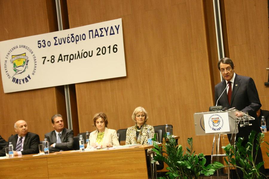 Μιλώντας από το βήμα του 53ου ετησίου συνεδρίου της ΠΑΣΥΔΥ, ο Πρόεδρος Αναστασιάδης αναφέρθηκε στους στόχους της Κυβέρνησης κάνοντας ειδικές αναφορές στη μεταρρύθμιση της δημόσιας υπηρεσίας και στον οδικό χάρτη υλοποίησης του ΓεΣΥ.