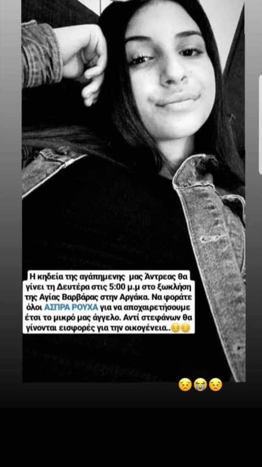 Η κηδεία της Άντρεας θα τελεστεί αύριο, στις 5:00 το απόγευμα, από το ξωκλήσι της Αγίας Βαρβάρας στην Αργάκα. Η οικογένεια απηύθυνε έκκληση σε όσους θα παραστούν να φορέσουν άσπρα ρούχα, καθώς αποχαιρετούν ένα μικρό άγγελο. Παρακάλεσε, επίσης, όπως, αντί στεφάνων, γίνονται εισφορές στην μνήμη της για την οικογένεια.