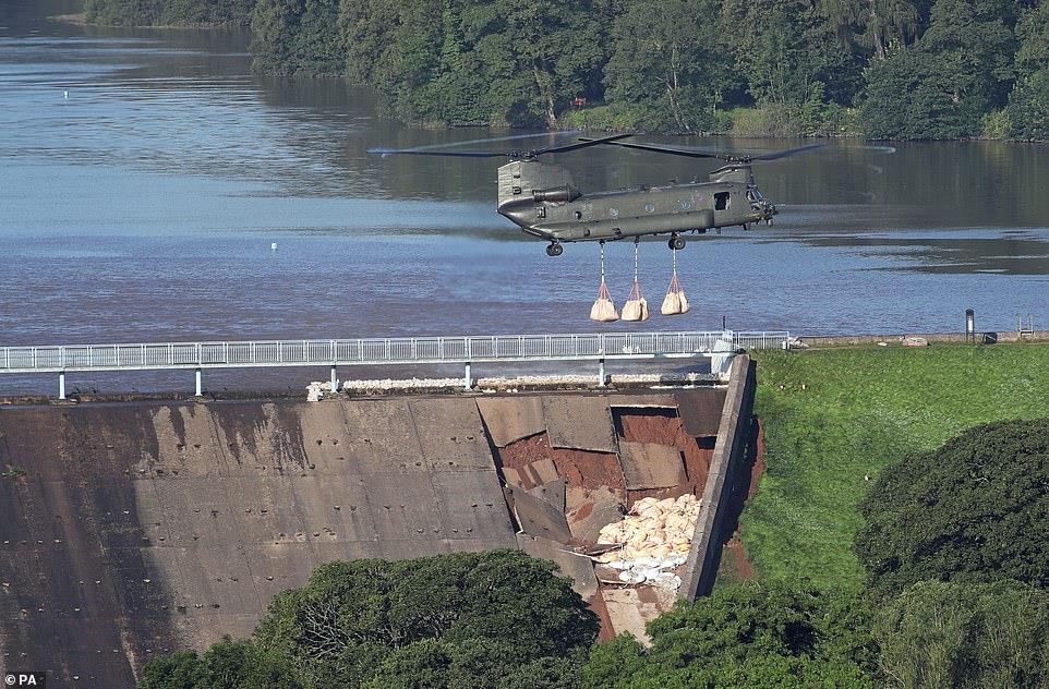 Ελικόπτερο της πολεμικής αεροπορίας της Βρετανίας έριξε την Παρασκευή σακιά με αμμοχάλικο στην εξωτερική πλευρά φράγματος, προσπαθώντας να αποτρέψει την κατάρρευσή του, με αποτέλεσμα να πλημμυρίσει η παρακείμενη πόλη.